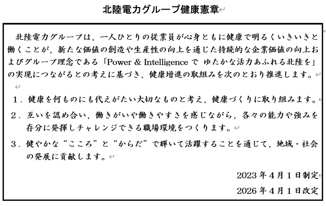 健康経営を経営戦略として位置づけ,全社を挙げて健康増進に積極的に取り組む企業風土の醸成を図るため,2023年4月に「健康憲章」を制定しました。