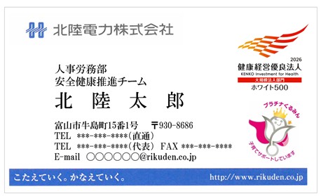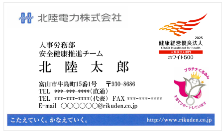 名刺にロゴマークを印刷し,お客さまやお取引先に健康経営優良法人制度や当社の健康経営への取組みをPRしています。