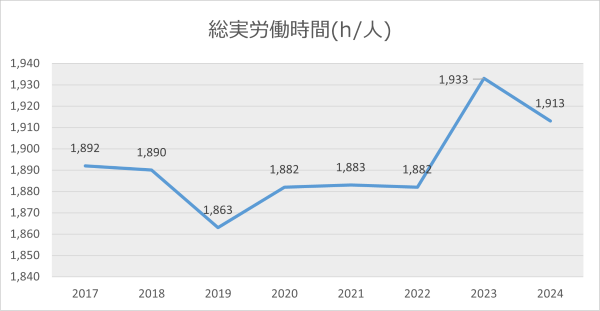 注:2023年度および2024年度は,能登半島地震対応により総実労働時間が増加(能登半島地震対応を除くと2023年度は1,883h/人,2024年度は1,903h/人)